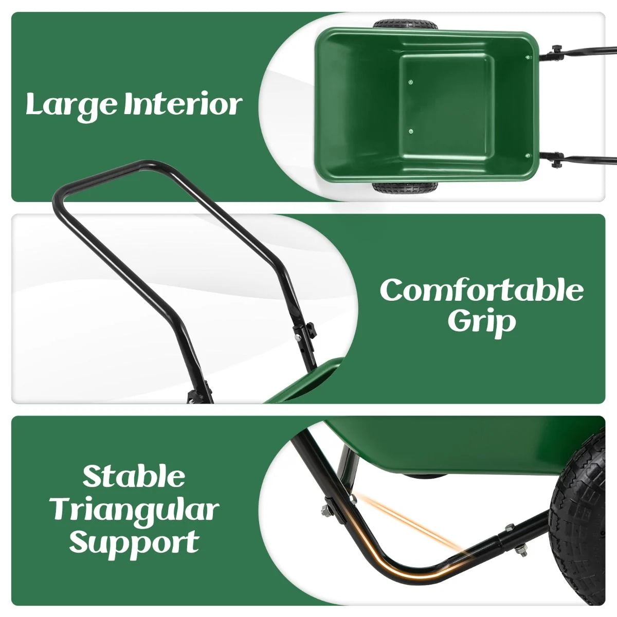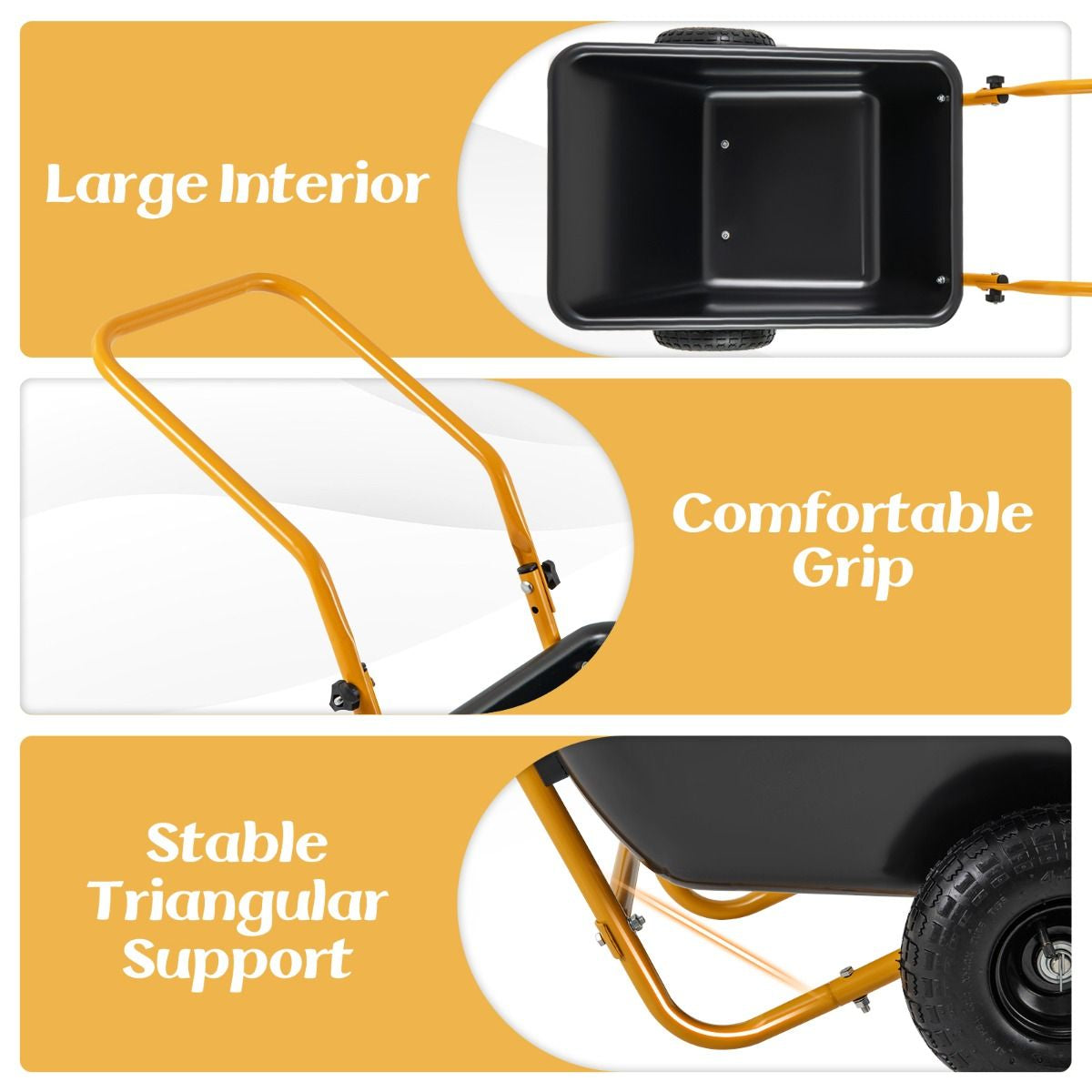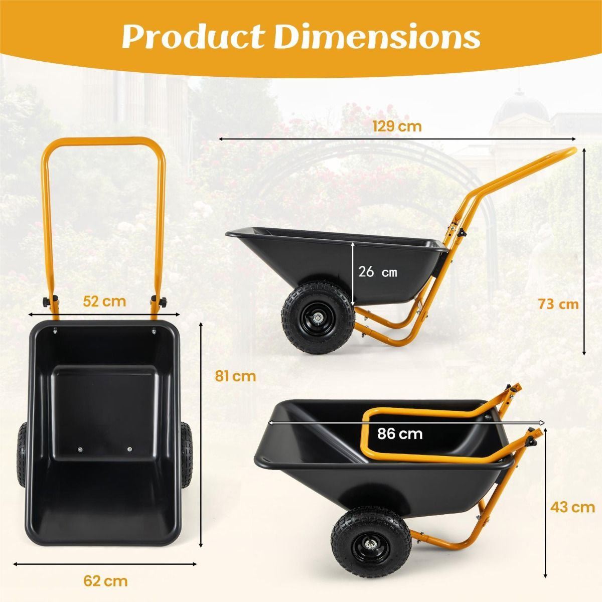 Stable Dual-Wheel Design: Equipped with large 26 cm pneumatic tires, the utility yard wheelbarrow offers better impact resistance, wear resistance, noise reduction, and slip resistance. It allows for effortlessly maneuvering over various terrains, such as sand, dirt, pavement, grass, etc.