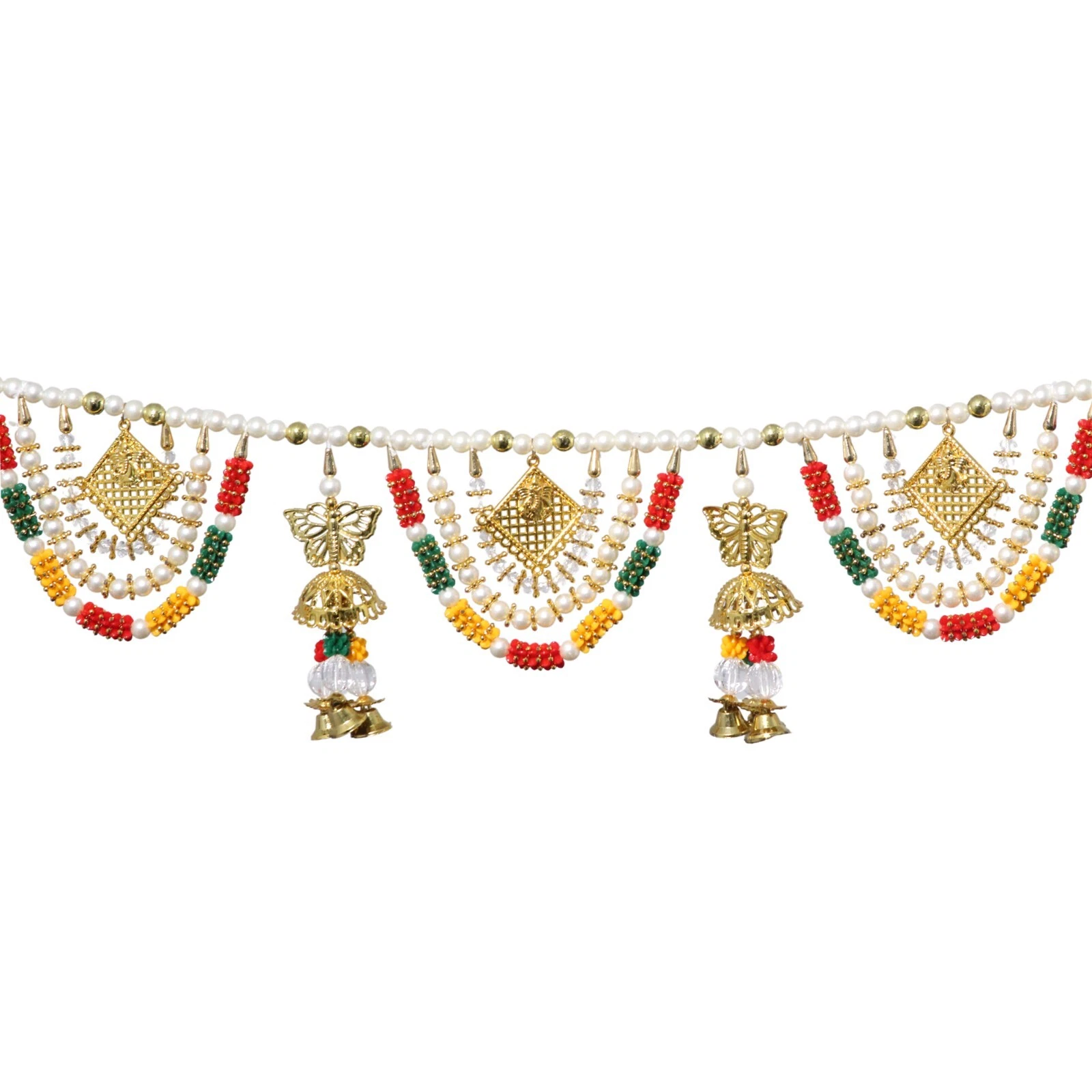 Add colour to your doorway or interior decor with this vibrant indian toran. Crafted on a sturdy double string, a chain of white pearl like beads has multiple colourful drapes with a checked square sitting Ganesh motifs in the middle. They are accompanied by butterfly and bell tassels in between, hence this toran brings a lively touch to any space..