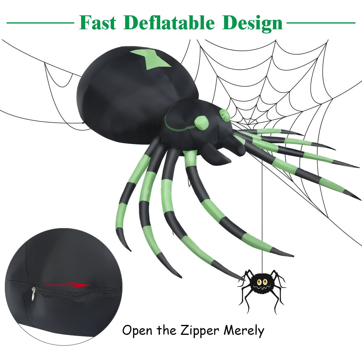 Easy to Inflate and Use: This inflatable giant spider is simple to use and has a self-inflating design. It can automatically inflate in moment after being electrified, and will be presented in front of your family and neighbors in seconds.