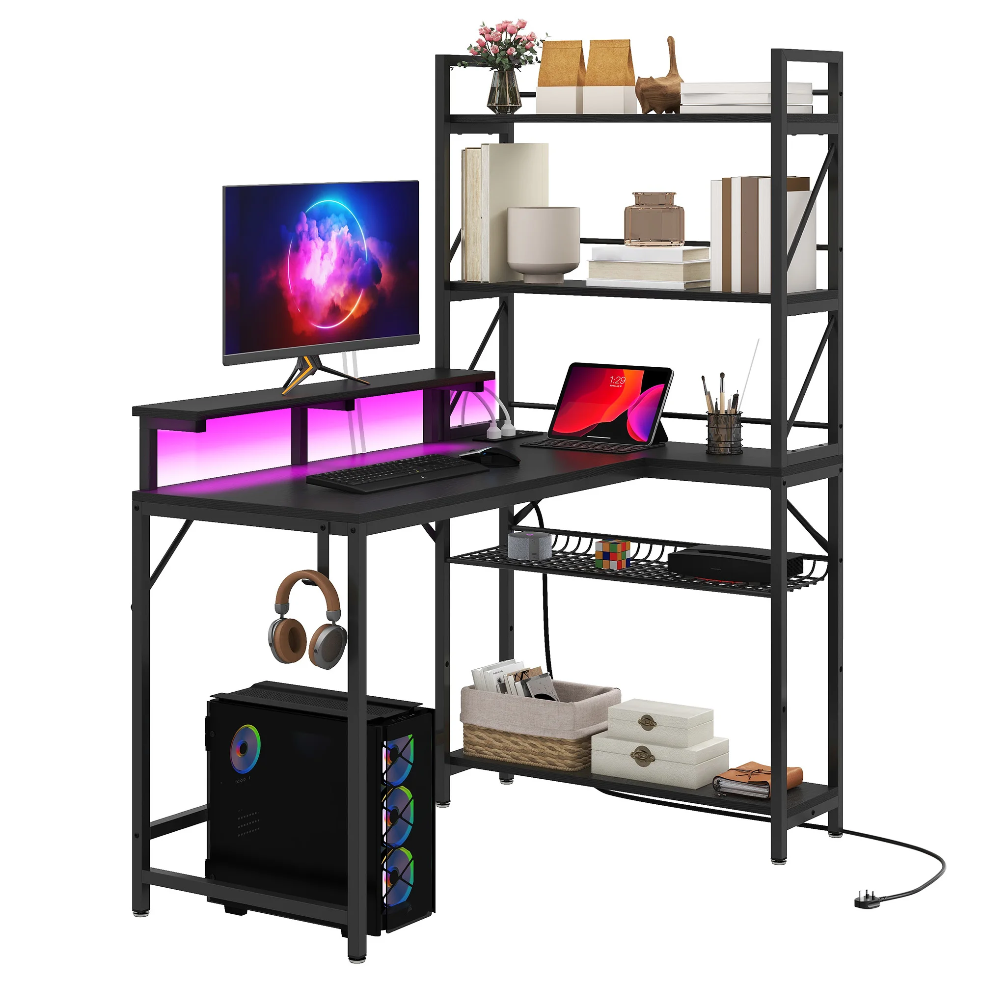 L-Shaped Gaming Desk - Black 106Cm Corner Desk with Power Outlets, LED Lights & Storage Shelves for Home Office