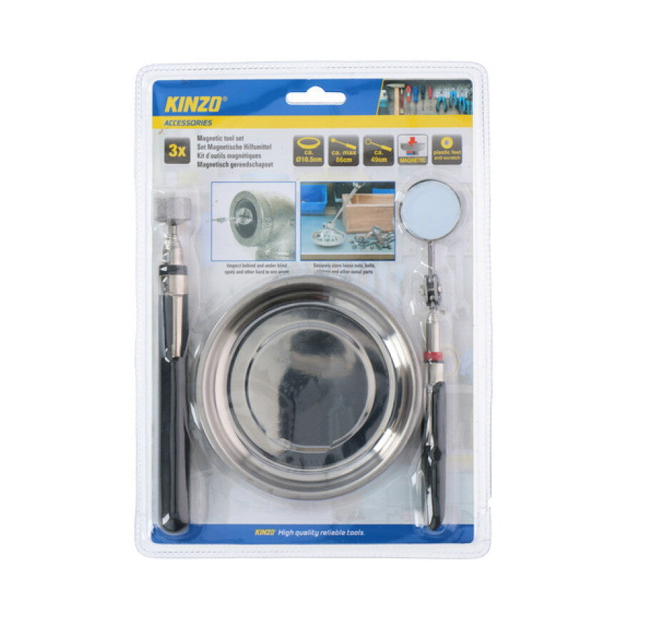 •This Kinzo 3 Piece Magnetic Tool Set consists of – 1 x Round Magnetic Dish (Diameter: 10.5cm), 1 x Extendable Magnetic Pick Up Tool (Maximum Up To 86cm) and 1 x Extendable Inspection Mirror Tool (Maximum Up To 49cm). This set is ideal to use in mechanics, workshops, garages, professional purposes or even at home. It is also a great gift during birthdays, Christmas and more