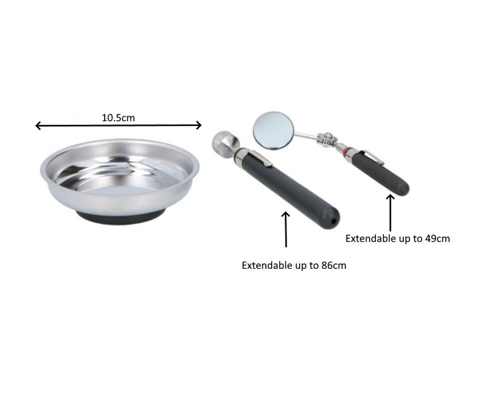 •Keep all your loose screws, nuts, bolts and many other small metal parts with this complete magnetic tool set. A round stainless steel magnetic dish for secure storage of small metal parts such as nuts, bolts and screws. This set also features an extendable magnetic pick up tool and inspection mirror, so small metal parts can be picked up from a far distances and you can inspect behind or under blind/restricted spots without difficulty.