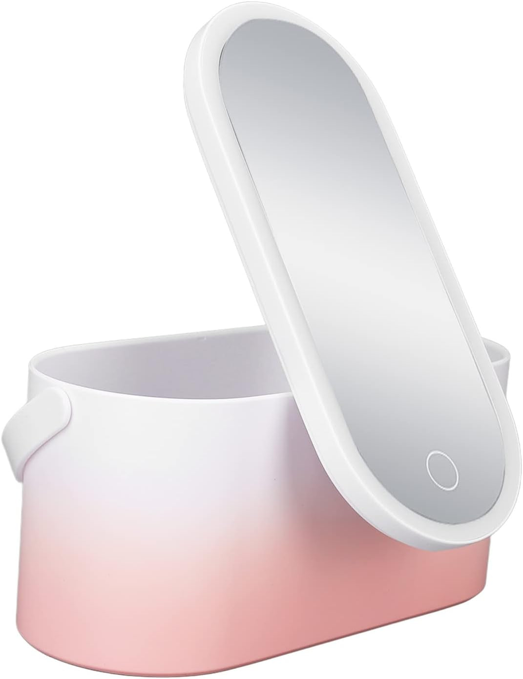 Makeup Case Pink Gradient Portable Large Capacity Foldable Rotating LED Light Makeup Storage Box with Makeup Mirror Smart Chargeable for Home Travel Use