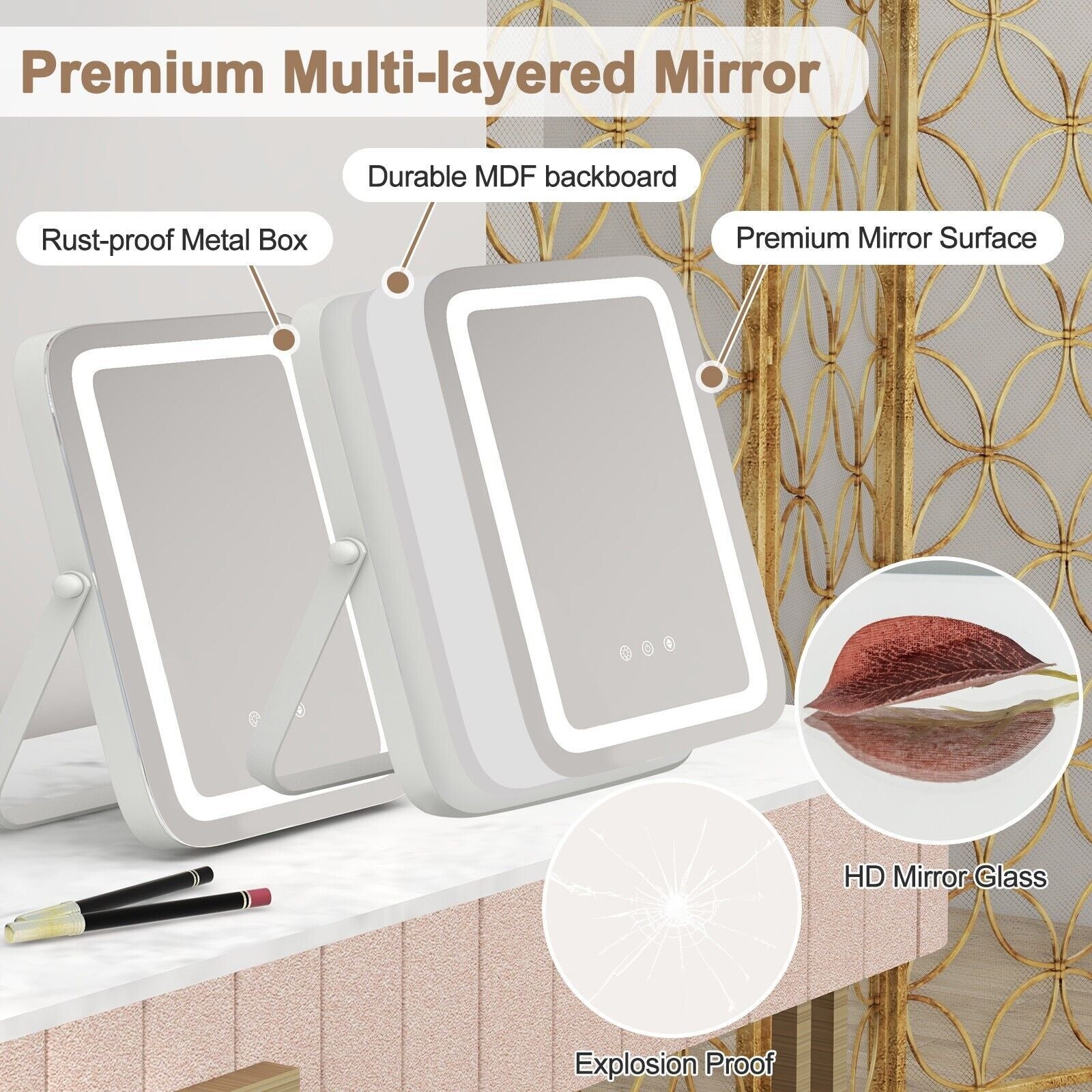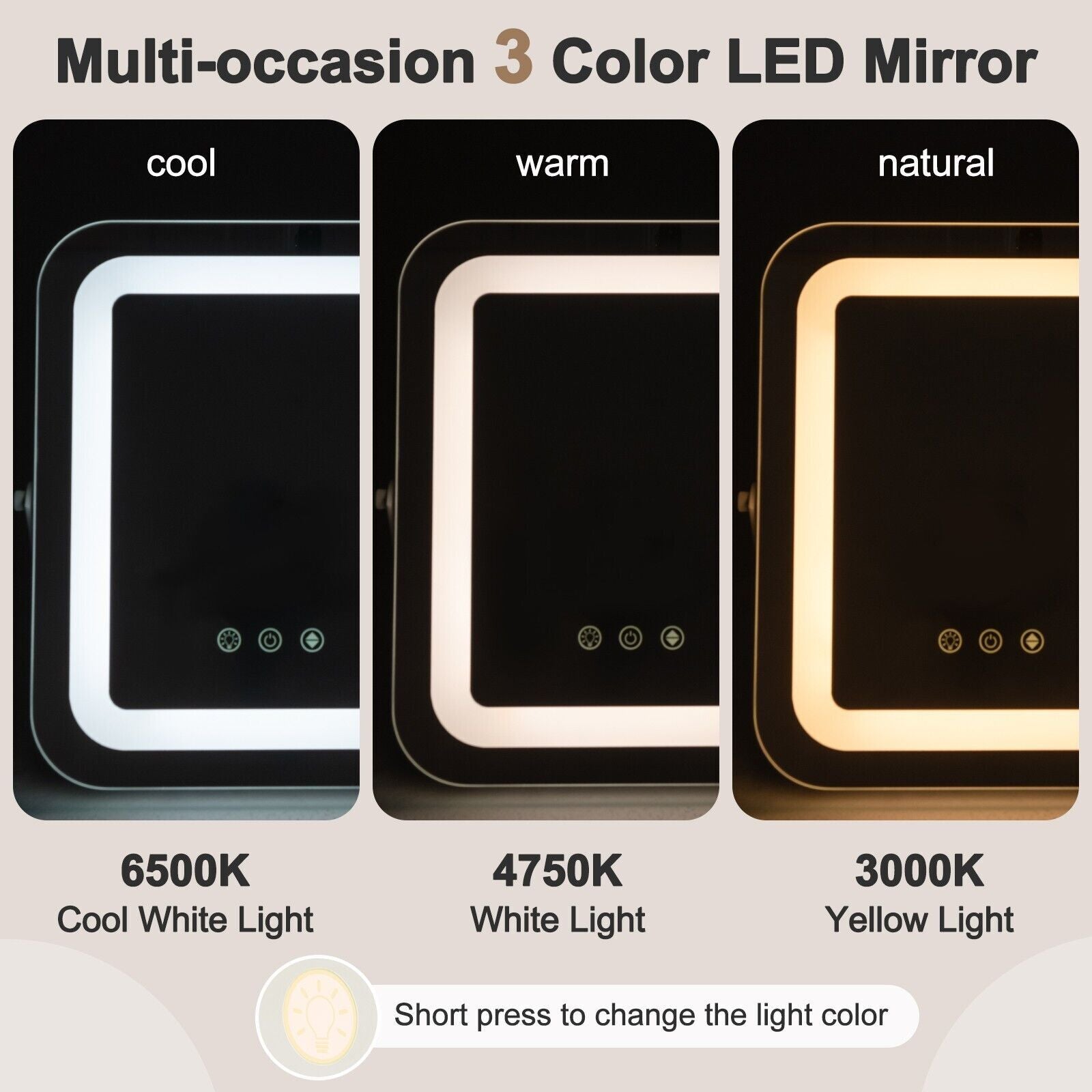Experience the ultimate comfort and convenience while enhancing your makeup game with our 3 Color LED Vanity Mirror. Offering three different LED light options, including 6500K cool white light, 4750K white light, and 3000K yellow light, this mirror allows you to effortlessly switch between cool, warm, and natural lighting. Meanwhile, the brightness can be easily adjusted to create a customized and suitable makeup experience. In addition, our mirror is equipped with a 360° swiveling stand, providing you with a perfect and comfortable perspective for applying makeup. Furthermore, featuring a memory function, this mirror will remember the brightness and light color settings you used last time, allowing you to effortlessly pick up where you left off. Plus, crafted from high-quality materials, our mirror boasts a premium mirror surface, providing clear and accurate reflection. Additionally, the explosion-proof design adds an extra layer of security and peace of mind. You can surprise your loved ones on special occasions with this premium vanity mirror! Order now and revolutionize the way you do your makeup.