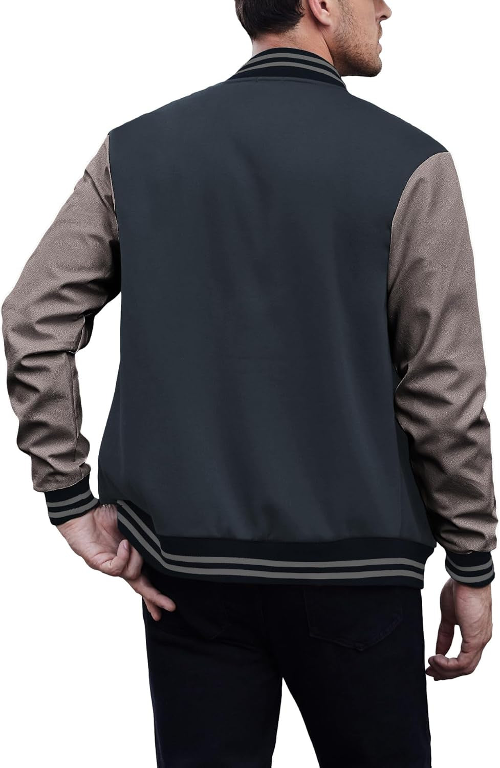 This is a piece of varsity jacket that symbolizes "excellent"! This leather baseball jacket continues the classic fitted fit, with a wool body and faux leather sleeves for a soft, lustrous, smooth material.Lightweight at the same time, the warmth is also greatly improved! The perfect combination of spliced design and striped ribbed neckline and hem embellishes the overall sense of fun, not so old-fashioned, and reveals a masculine elegance.Although more preppy, this letterman jacket can still be worn with more formal shirts and trousers.