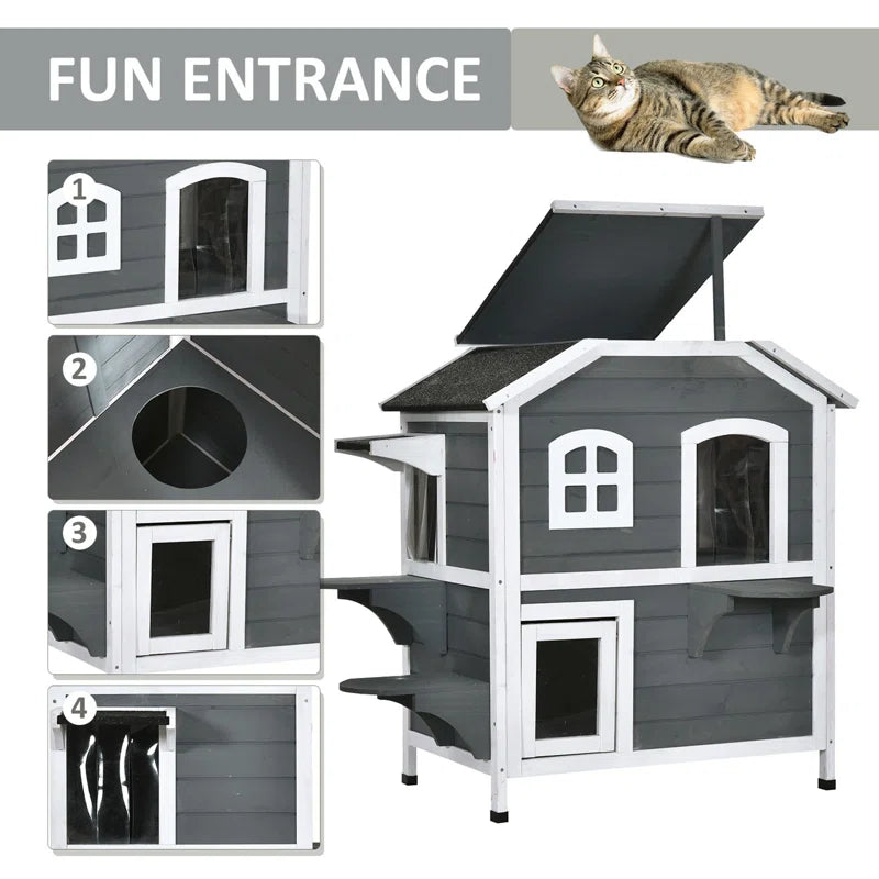 Your lovely cat is sure to enjoy this amazing cat house. This 2-story cat condo is a suitable room for 1-2 cats. Your furry friend will feel comfortable and secure while also staying away from inclement weather with our awesome cat house for outdoor cats. The catio features 3 jumping steps, 2 doors, a floor hole, and an escape door for easy access and fun, while also keeping your cat protected from the wind, rain, and snow. The platform opens for easy cleaning of your new cat furniture. 100% solid wood with paint for your and your pets' health. Solid wood is sturdy and stable. with 2 floors, a large space for pets playing and resting. Asphalt eave and waterproof painting can be fully adapted to any weather conditions. Raised floor to resist moisture. Suitable to use outdoor and indoors. Escape door and side doors, jump platforms, and floor holes provide a fun entrance for cats. The openable platform for easy cleaning and great ventilation