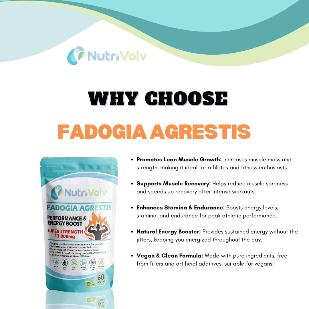 Introducing Nutrivolv Fadogia Agrestis 13,000mg, a super strength 20:1 extract designed to elevate your fitness and performance. These Fadogia Agrestis capsules provide powerful support for athletes and fitness enthusiasts seeking to enhance their strength and performance. Whether you're training for muscle growth or looking for a natural athletic performance booster, this supplement is formulated to help you reach your goals. Even common misspellings like fatogia agrestis or fadogia agrest point to the same potent, high-strength supplement that delivers exceptional results. Ideal for those looking for a test booster, Nutrivolv Fadogia Agrestis works as a natural muscle growth supplement, enhancing both workout endurance and testosterone levels. This bodybuilding supplement is perfect for athletes and individuals aiming to improve strength and stamina. As a vegan Fadogia Agrestis supplement, it offers an all-natural solution for both men and women, providing testosterone enhancing pills that aid in muscle performance and recovery. With its potent formula, this natural strength and endurance supplement supports lean muscle growth and faster recovery post-workout.