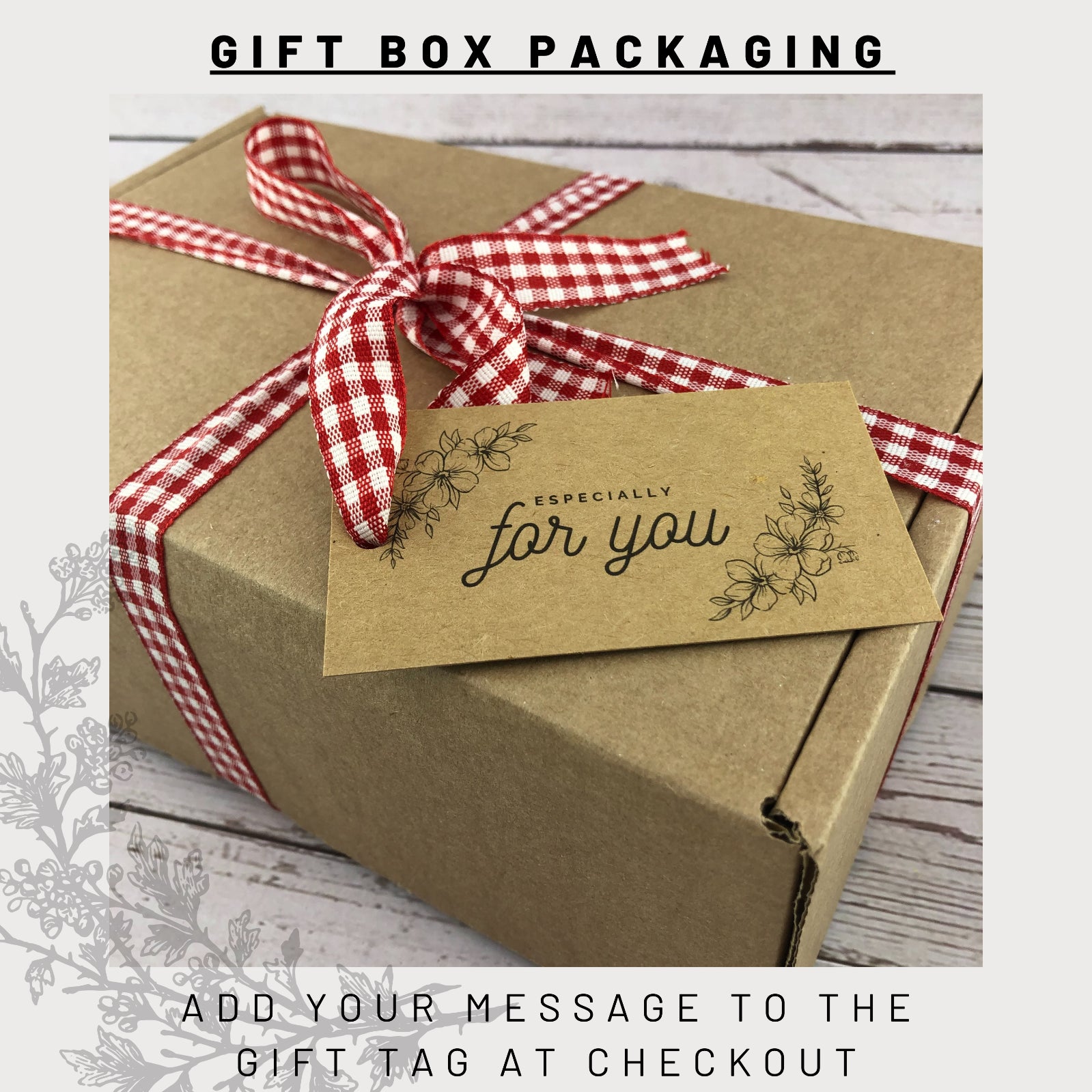 The products are sent in a quality kraft box and wrapped with a gingham ribbon tie. The box will be sent in an additional box to keep everything clean. Your FREE gift message will be handwritten on to the a beautiful gift tag and attached using the ribbon.