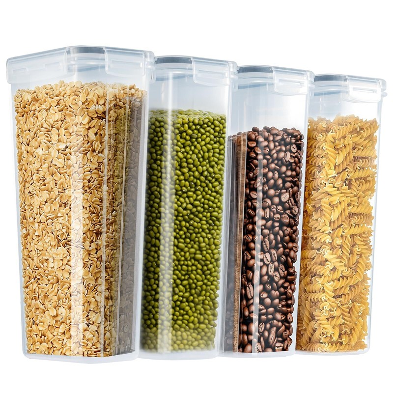 - Same Size, Easy Stacking – Come with 4 premium food storage canisters, perfect for dry goods like pasta, cereal, flour or rice. Designed for seamless stacking in your cupboard or pantry. With the stackable design, these plastic storage containers will make more efficient use of every inch of your home kitchen.