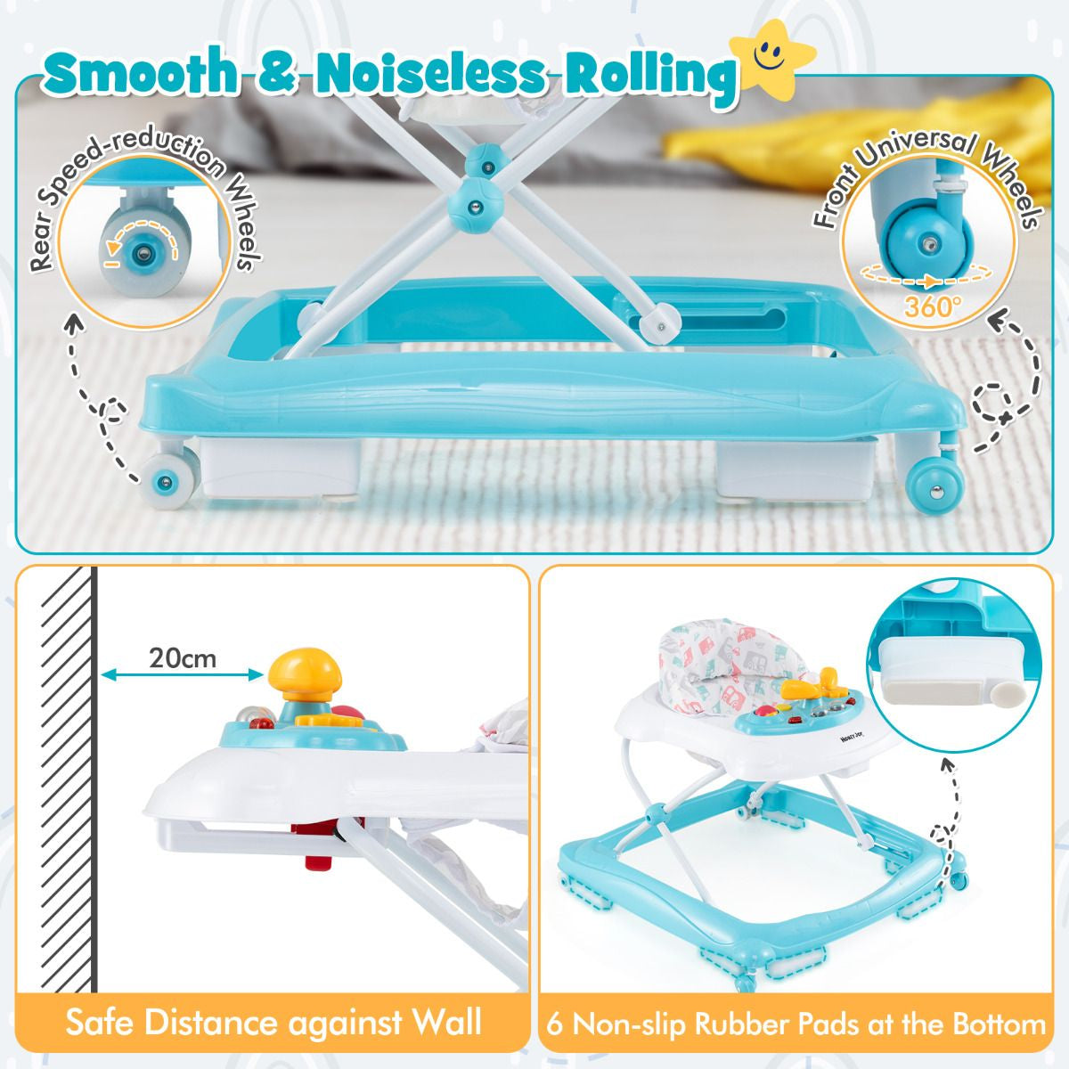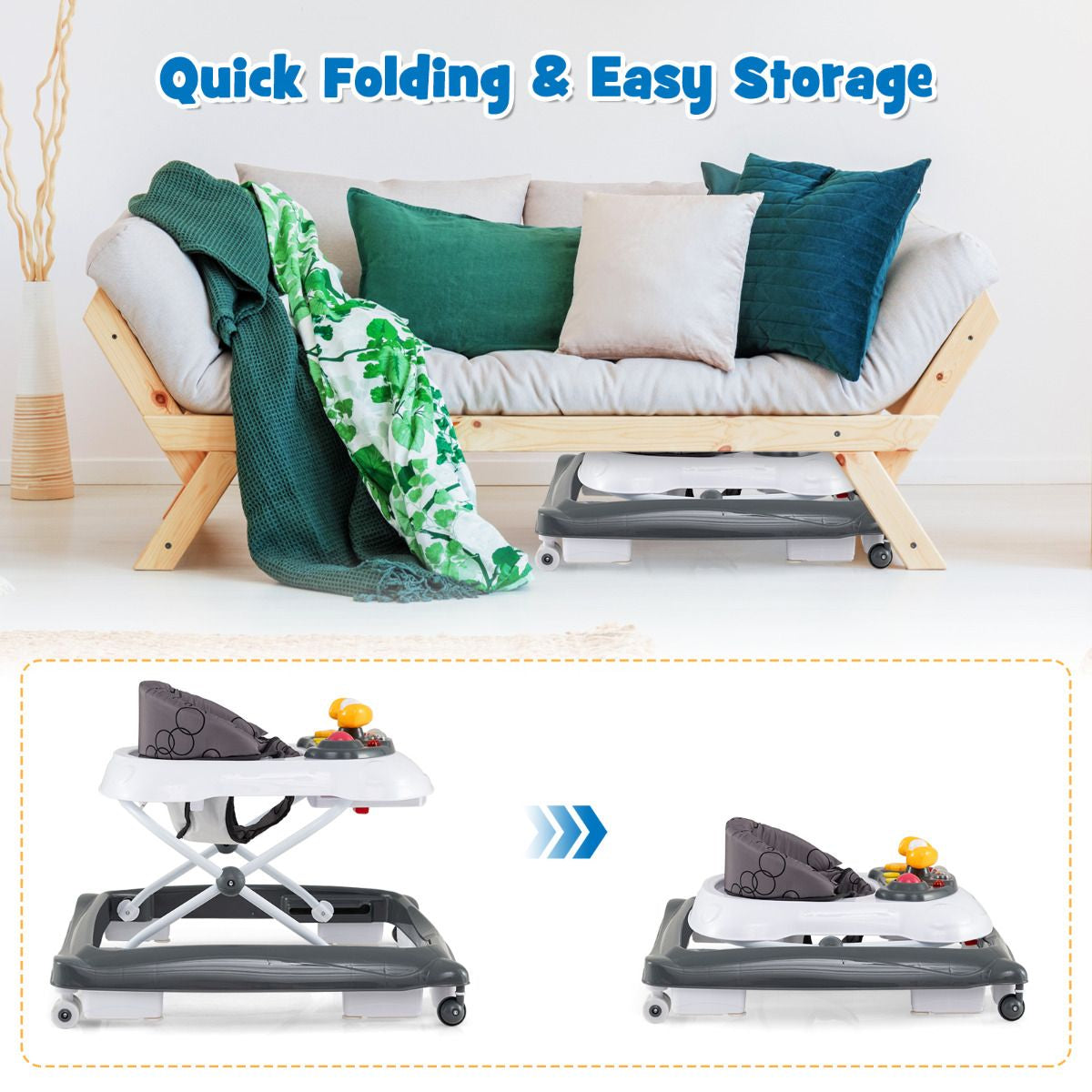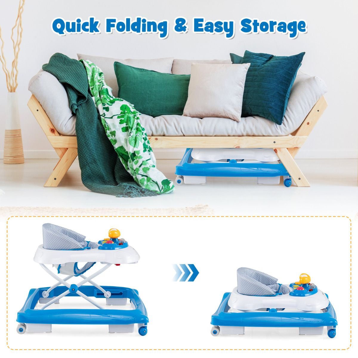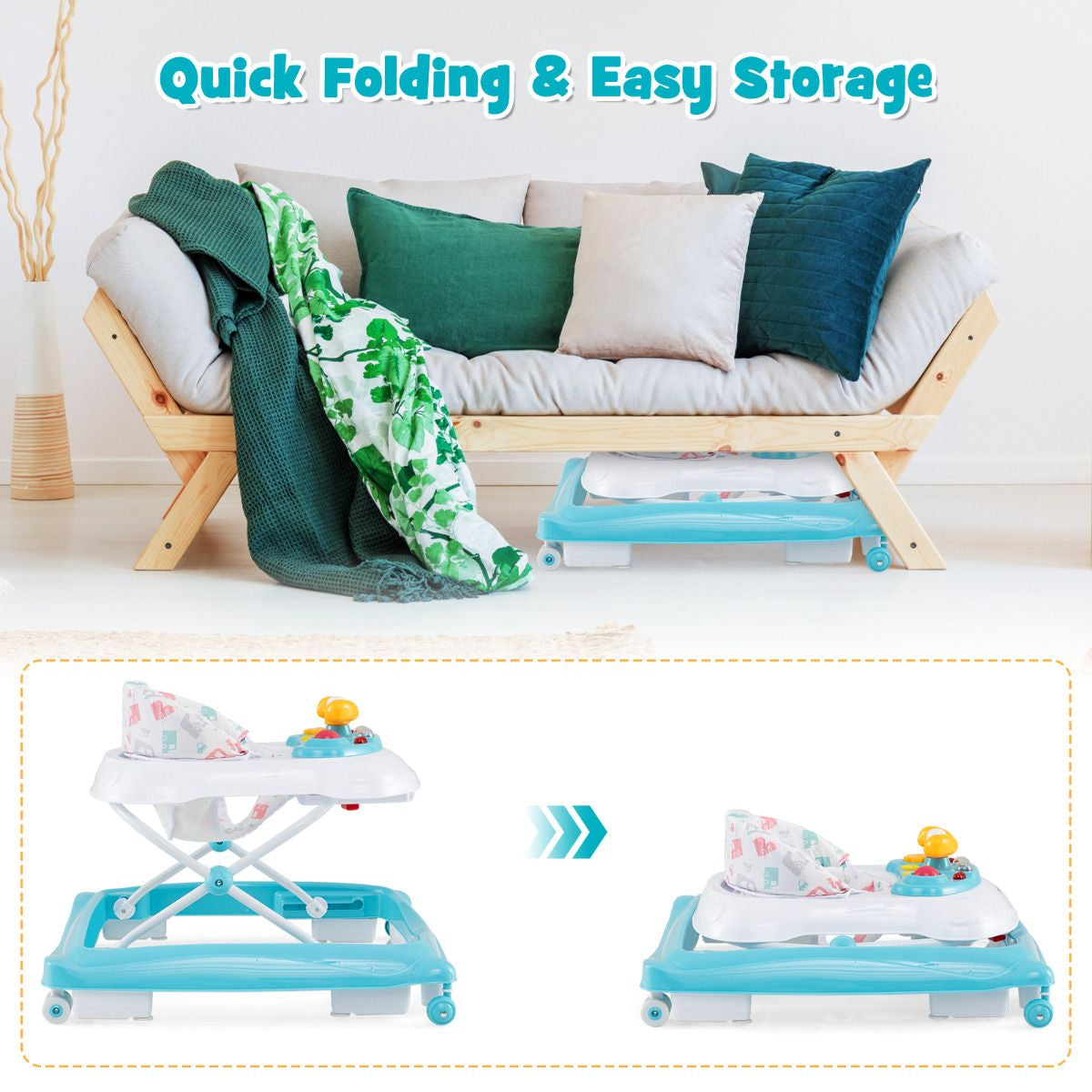 Foldable & Portable Design: This baby walker is foldable, making it space-saving for storage and transport. Simply fold it up and put it in the car trunk or store it in the corner or under the bed when it's not in use. It's the perfect solution for busy parents on the move.