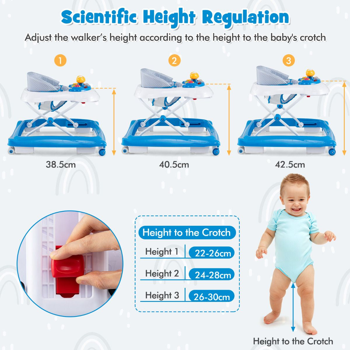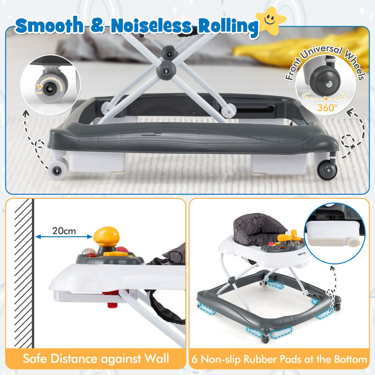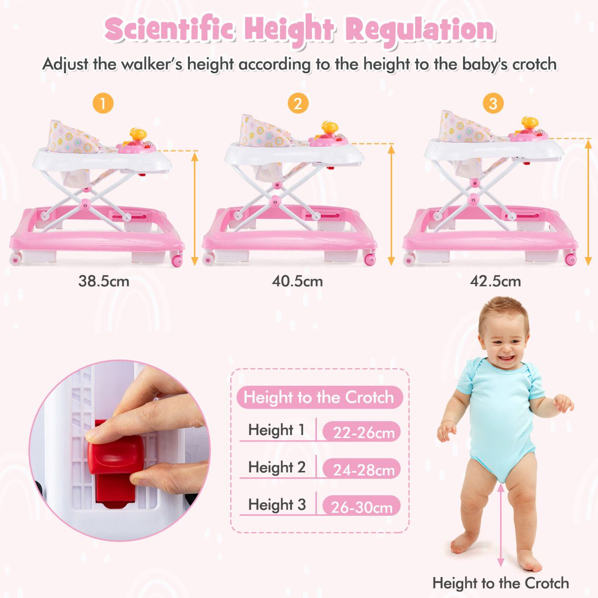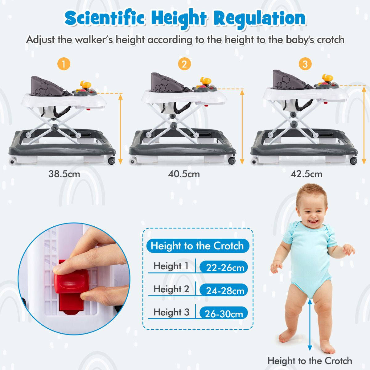 3-Level Adjustable Height: This foldable baby walker features 3 adjustable height positions to offer the optimal height for growing kids. Whether your baby is just starting to take those first steps or is already cruising around, you can easily adapt the walker to suit their needs and provide optimal support.