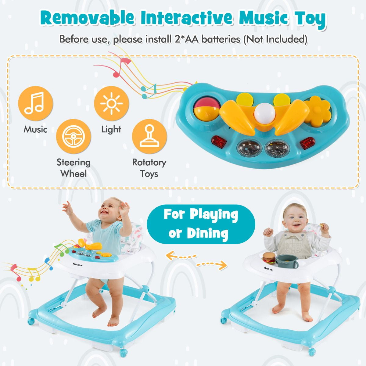 Engaging Entertainment: The interactive music tray activates with a touch, playing cheerful melodies and lighting up with colorful lights, enhancing your baby's sensory experience while they explore and play. Note: music tray requires 2 AA batteries (not included). Besides, the detachable music tray makes it ideal for playing and eating.