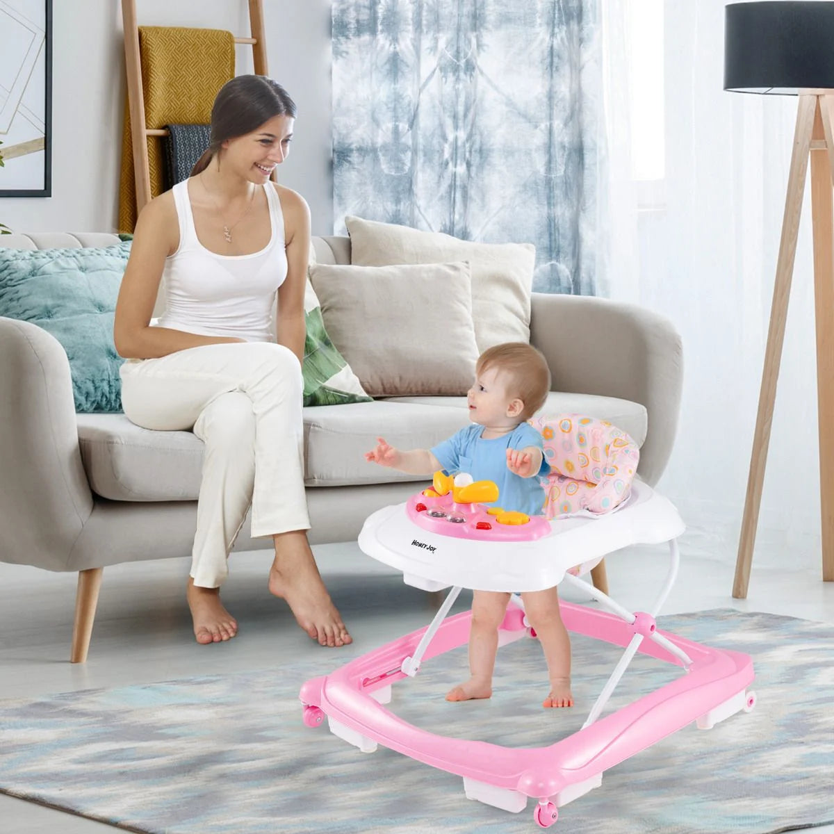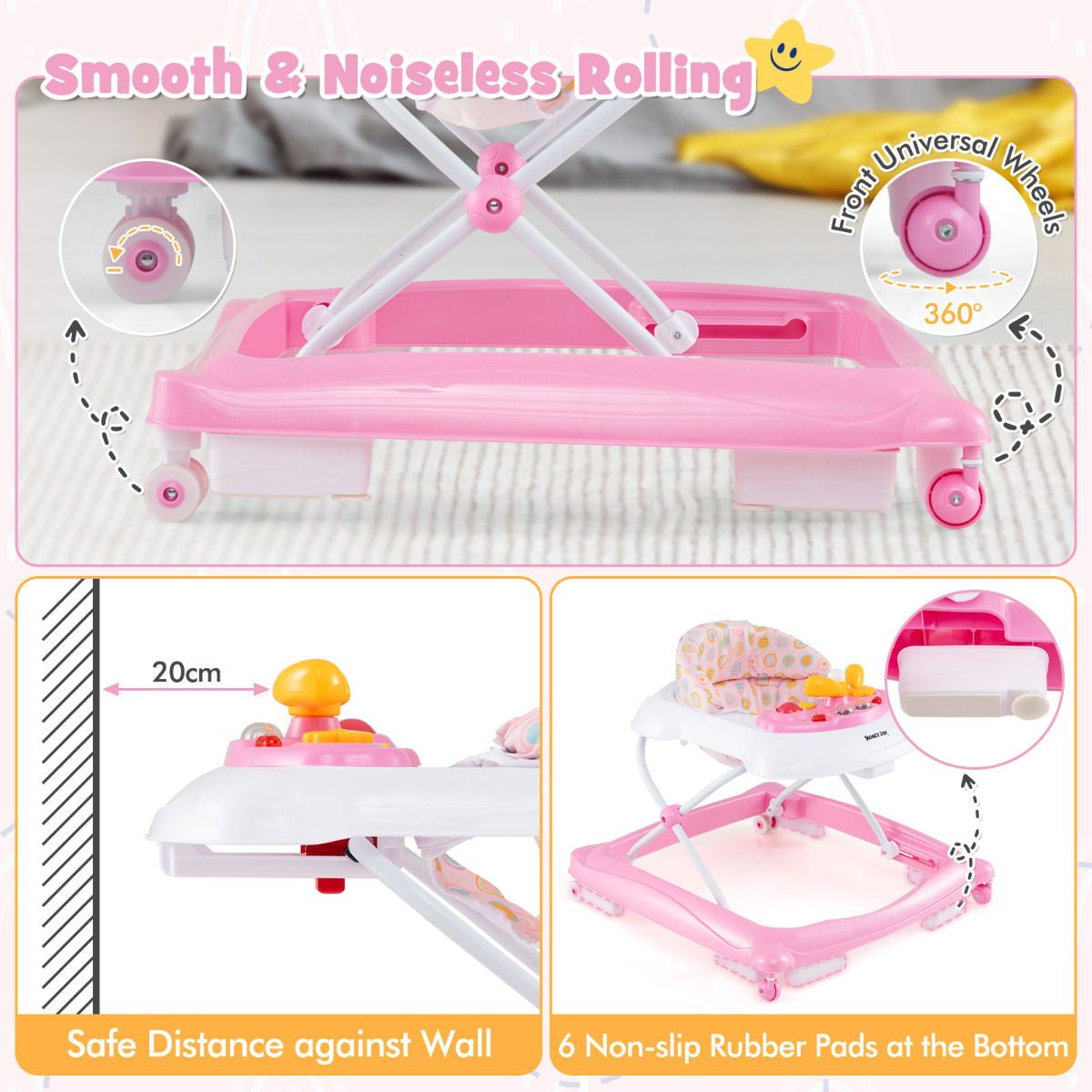 Featuring 3 adjustable heights, this toddler walker provides the optimal height for your baby, which prevent developing bowlegs. With a plush padded seat and a music tray with lights, this walker offers comfort and interactive playtime. Safety always comes first. This baby walker is equipped with non-slip foot pads to increase stability when accidents happen. Plus, the ample safety distance protects your baby from pinching hands. The foldable design allows for easy storage and transport.