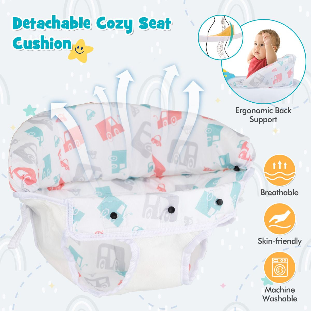 Comfy and Ergonomic Seat: Designed with your baby's comfort in mind, this baby walker features a thick padded seat cushion, which is not only soft and breathable but also detachable and machine washable. The ergonomic backrest gives ample suuport to your baby’s spine.
