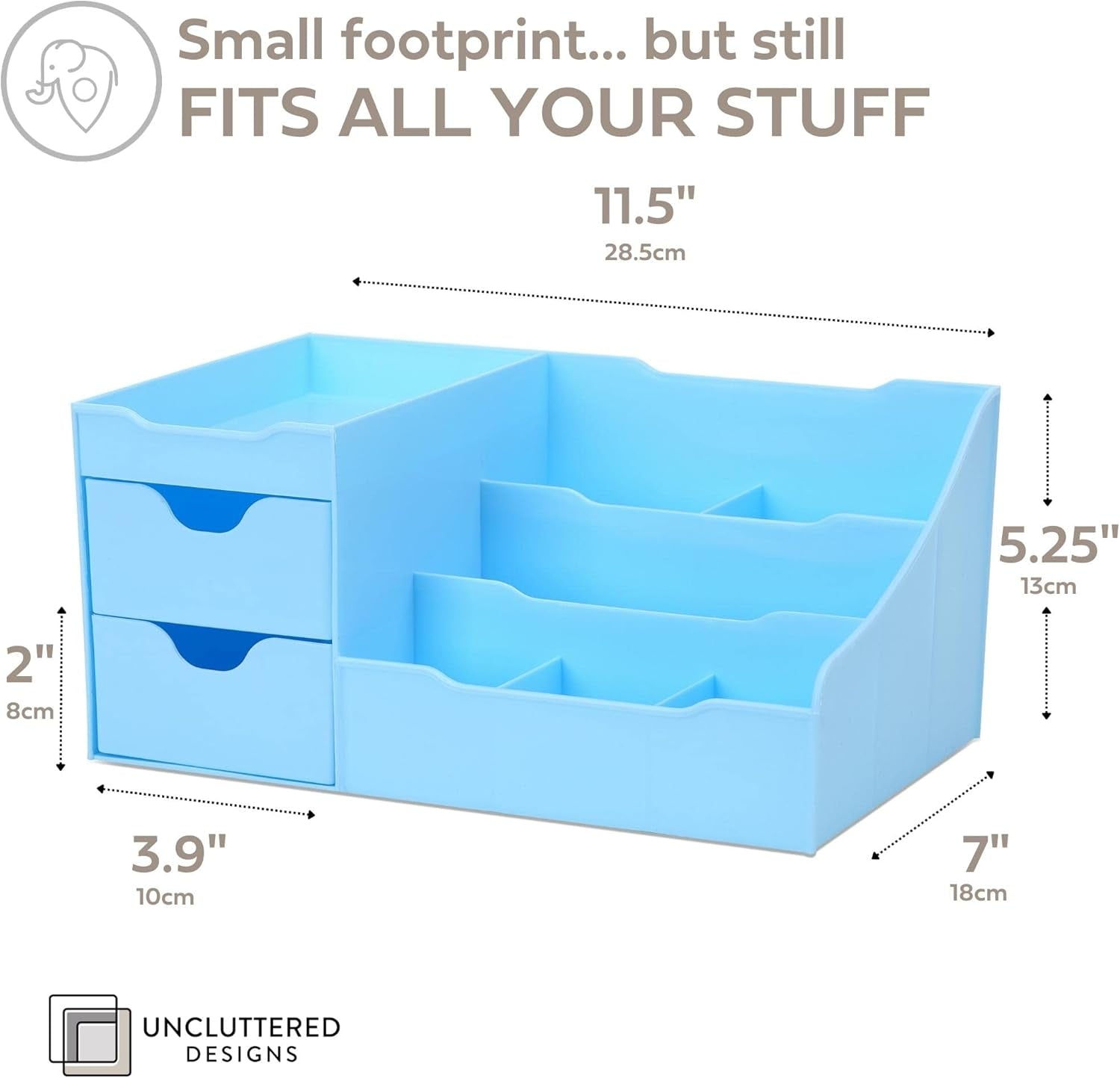 - EASY TO SEE ALL YOUR STUFF: Different sized slots and deep drawers make it easy to fit all your items and see them at a glance. Everyone has their own stuff to unclutter. We designed our cosmetic containers with structures and spaces to fit all your unique uncluttering needs.